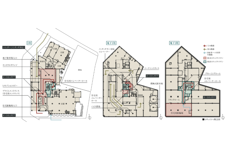 商業施設のエントランスと反対側に配した住宅用エントランスは住まいとしてのプライベート性が高められています。また、1階ではレセプションロビー、エレベーターホールのそれぞれのオートロックドアを通って、住宅用エレベーターへと向かいます。地下1階の駐車場からも、2つのオートロックドアを通って、エレベーターに乗ることができます。