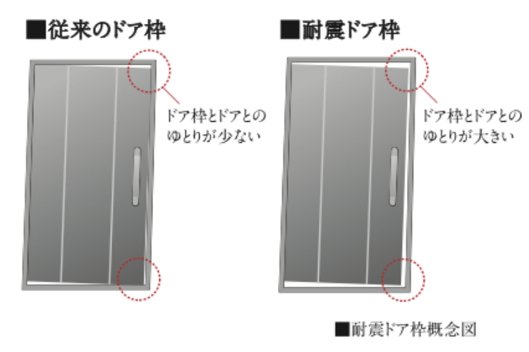 地震発生時、従来のドア枠では変形のためにドアがスムーズに開かなくなる場合があります。このような事態に配慮し、ドアと枠の間にゆとりを設けた耐震ドア枠が採用されています。