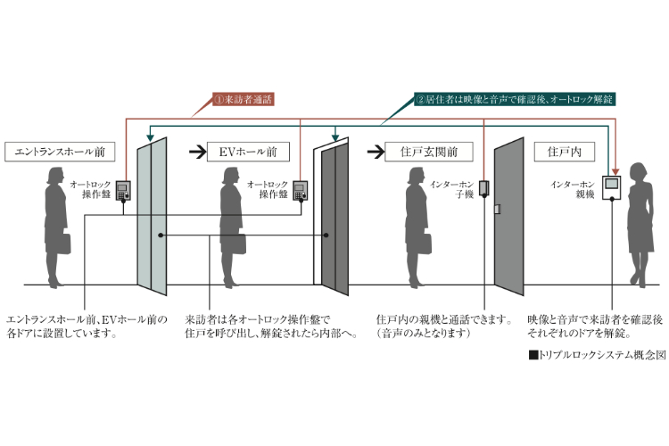 エントランスホール前、エレベーターホール前では、来訪者の声と映像を各住戸のTVモニターで確認し、さらに各住戸前で来訪者と通話できる安心の「トリプルロックシステム」が採用されています。複数のポイントでチェックすることにより、不審者の侵入を未然に防いでいます。
