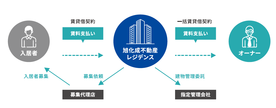 賃貸住宅を旭化成不動産レジデンスが一括で借上げ、貸主としてオーナー様に代わって、一切の管理・運営を代行するシステムです。
